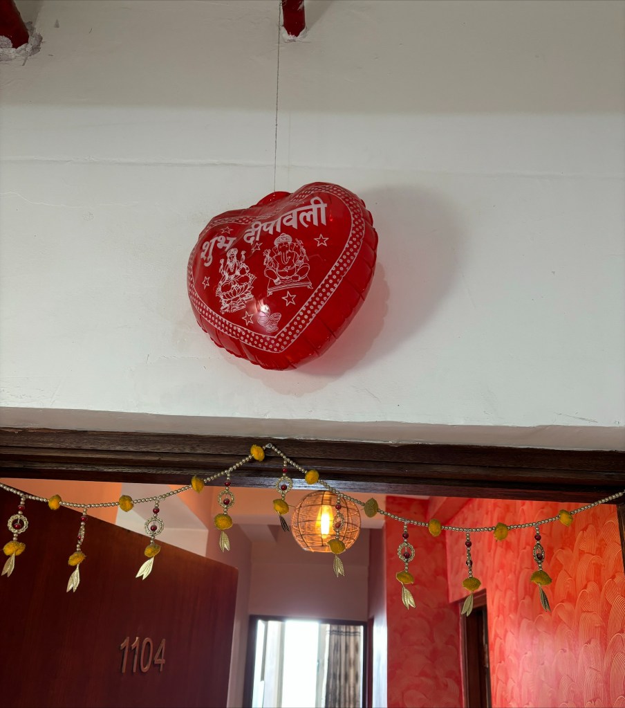 Anyway, I went out to shop for decoration items with a half heart, and in the next few hours, for my Kusum, I made decorations with Rangoli, electric Lights, Candles, Flowers, and Diyas and put a heart-shaped balloon (which was not a typical balloon but made of plastic or polyethylene-type material) in front of the main gate of our house. It was written ‘Subh Deepawali’ in Hindi on that balloon, which means in English ‘Happy Diwali’….Our house was sparkling like an Indian bride!Β