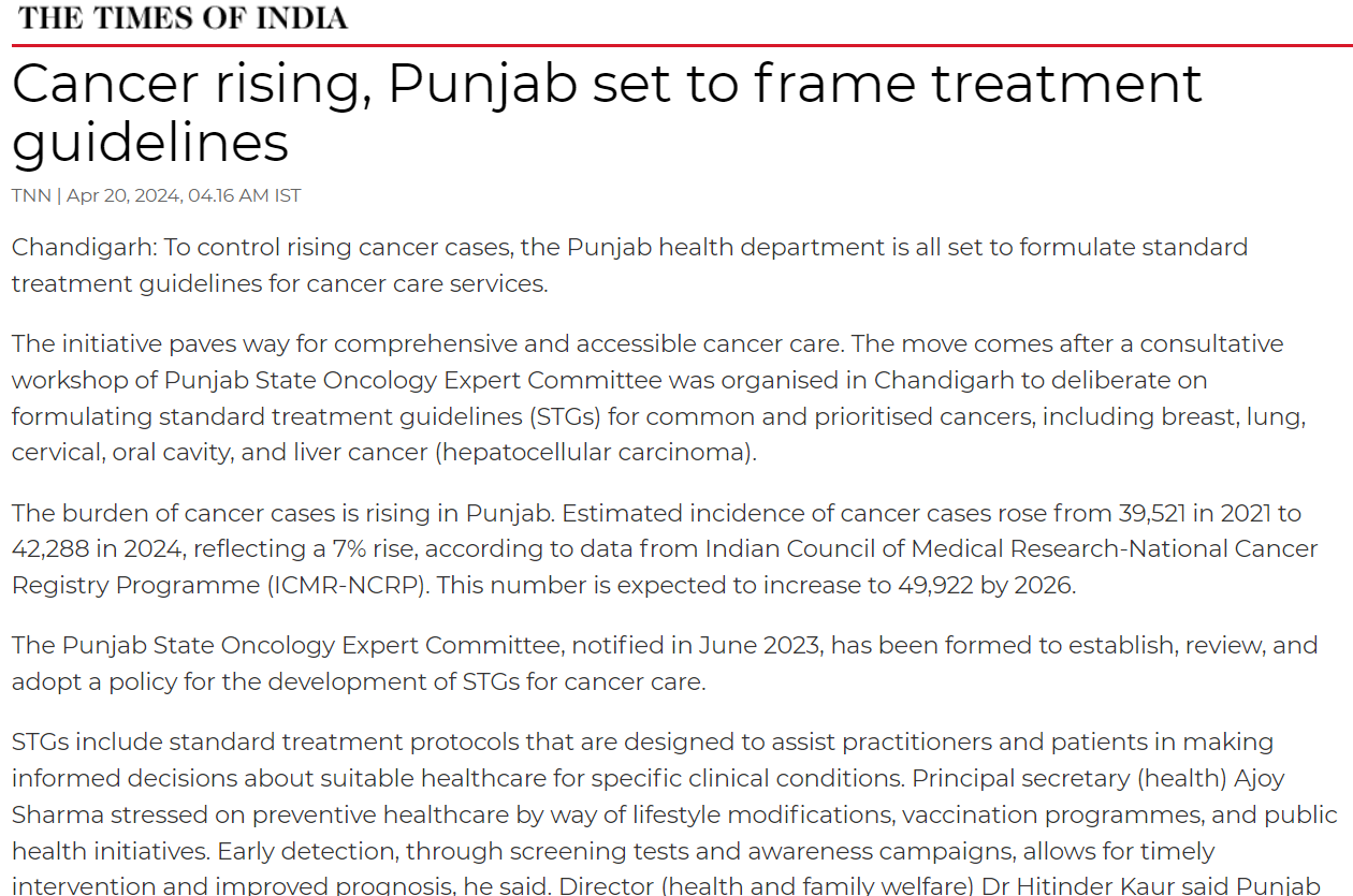 This week the project has started as we met in Chandigarh (India). It is a privilege to work along with nationโs top oncologists, policy makers, economists and senior officials of the Punjab government, to collaborate on developing and formulating a ๐๐จ๐ฅ๐ข๐๐ฒ for establishing Standard Treatment Protocols for common ๐๐๐ง๐๐๐ซ๐ฌ in Punjab.